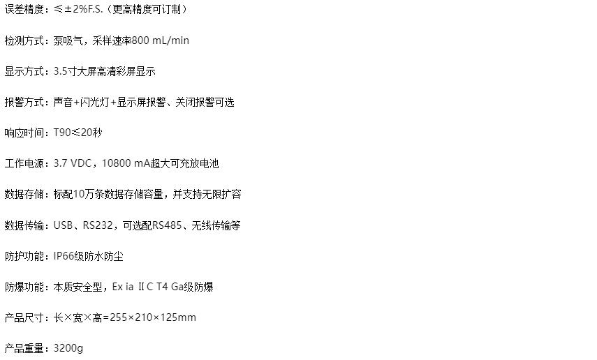 移动手提式恶臭气体检测仪为例,可以同时检测并显示GB14554中的全部8项恶臭污染物指标,并可选配PM2.5、风速、温度、PM10、噪声、风向、湿度、照度等检测项目指标。另外,该仪器配有10800 mA超大容量电池,可连续长时间进行工作,具有IP66级防水防尘功能和Ex ia ⅡC T4 Ga级本质安全型防爆功能,可适用于各种复杂工况场所中。